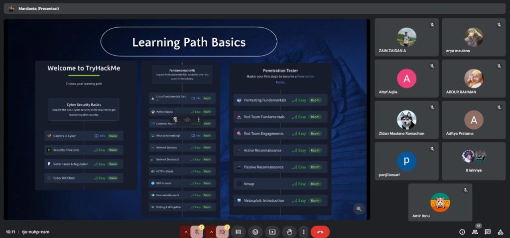 Mardianta Putra Anggara, S.Kom., yang juga dikenal sebagai pentester berpengalaman, menyampaikan bagaimana peretas pemula dapat mempelajari etika hacking dan membangun keterampilan yang bertanggung jawab untuk menjaga keamanan sistem. Sementara itu, Arya Maulana menyoroti berbagai metode serangan siber yang umum dilakukan, serta cara-cara efektif dalam melakukan deteksi dan mitigasi serangan tersebut.