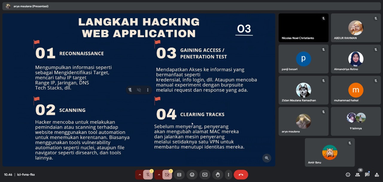 Acara dimulai pukul 09.00 dan berlangsung hingga pukul 15.00 dengan serangkaian sesi yang informatif dan interaktif. Kedua narasumber memaparkan teknik-teknik dasar hacking dan memberikan wawasan mengenai pentingnya memahami dunia siber dari perspektif keamanan. Selain memberikan materi, mereka juga berbagi pengalaman praktik lapangan dalam mendeteksi, mencegah, dan mengatasi serangan siber.